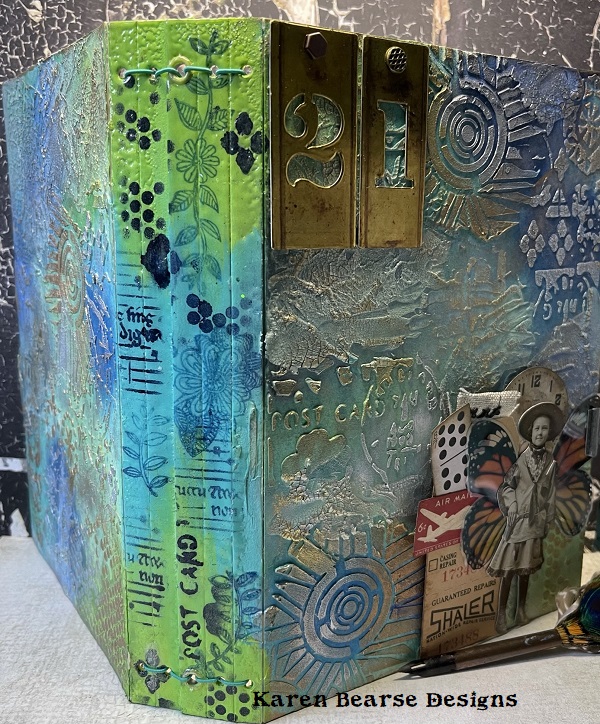 Last step is to slip the booklet into my already completed Full Size Journal. I love this size & Eileen Hull's diecut makes these books easy to create. You can find the full tutorial to the cover of the Journal here. I am going to change my date to 22, just waiting on the stencil number to arrive. The booklets slide in & out through elastic which makes working in them a breeze.